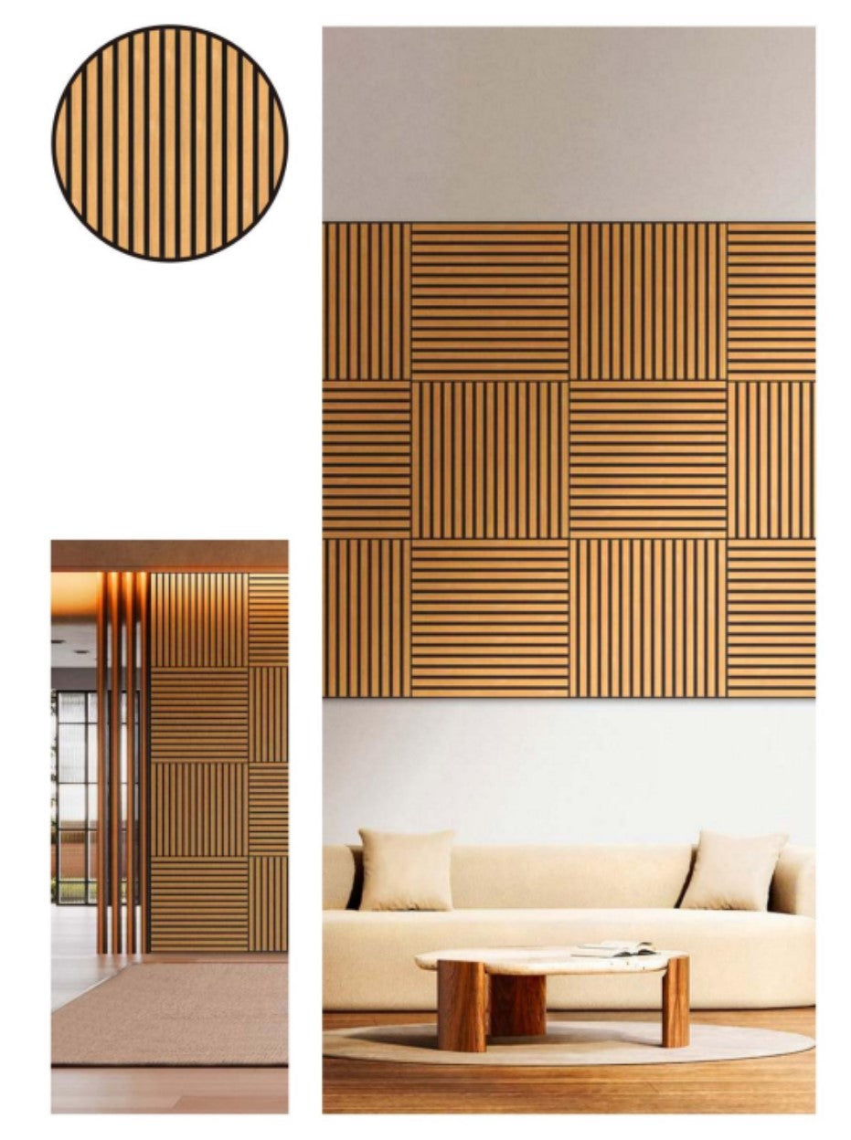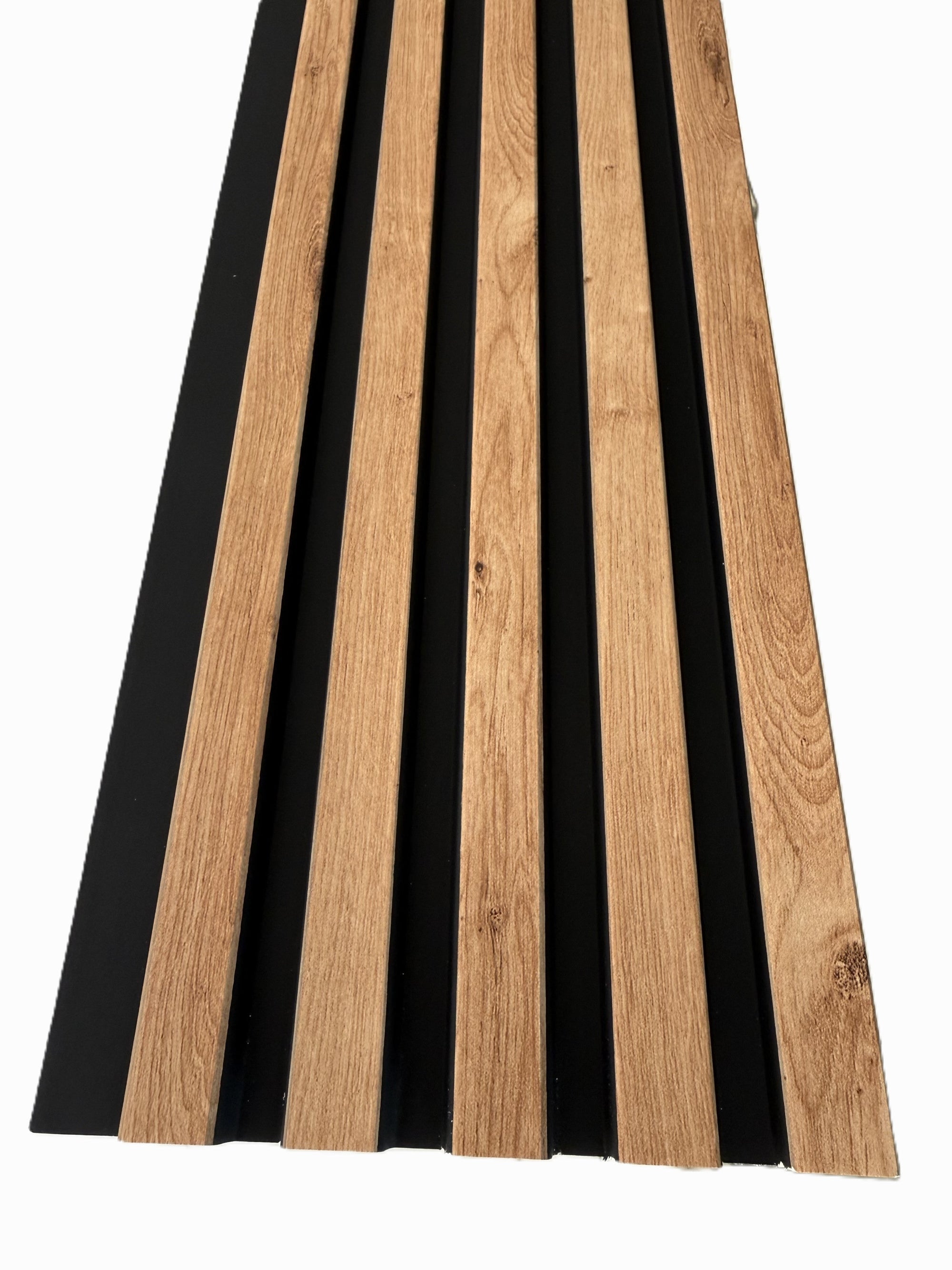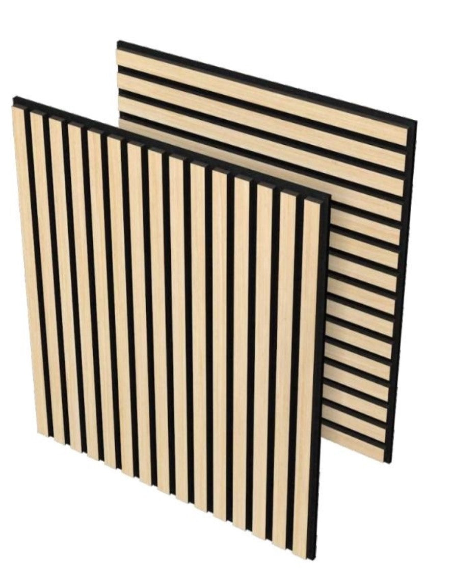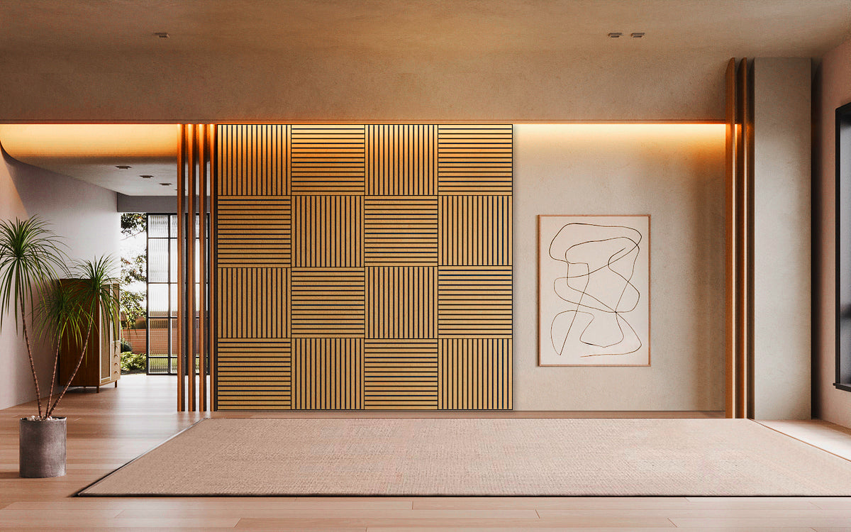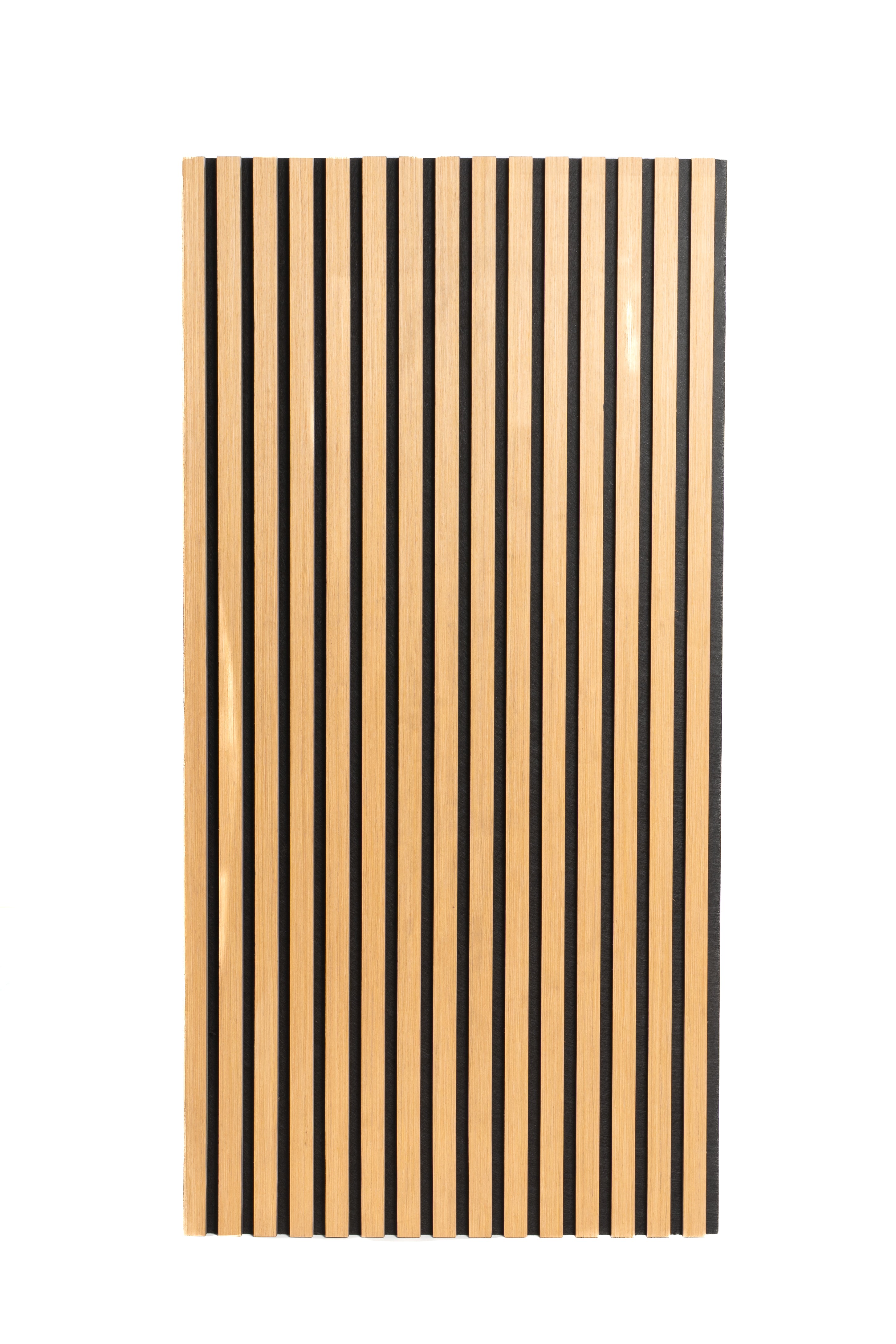 À camada acústica junta-se um painel ripado em MDF, com revestimento de madeira natural, que confere um aspeto diferenciado, autêntico e elegante ao produto. Este painel pode ter acabamentos de várias cores, da madeira mais clara à mais escura, aumentando a sua versatilidade.