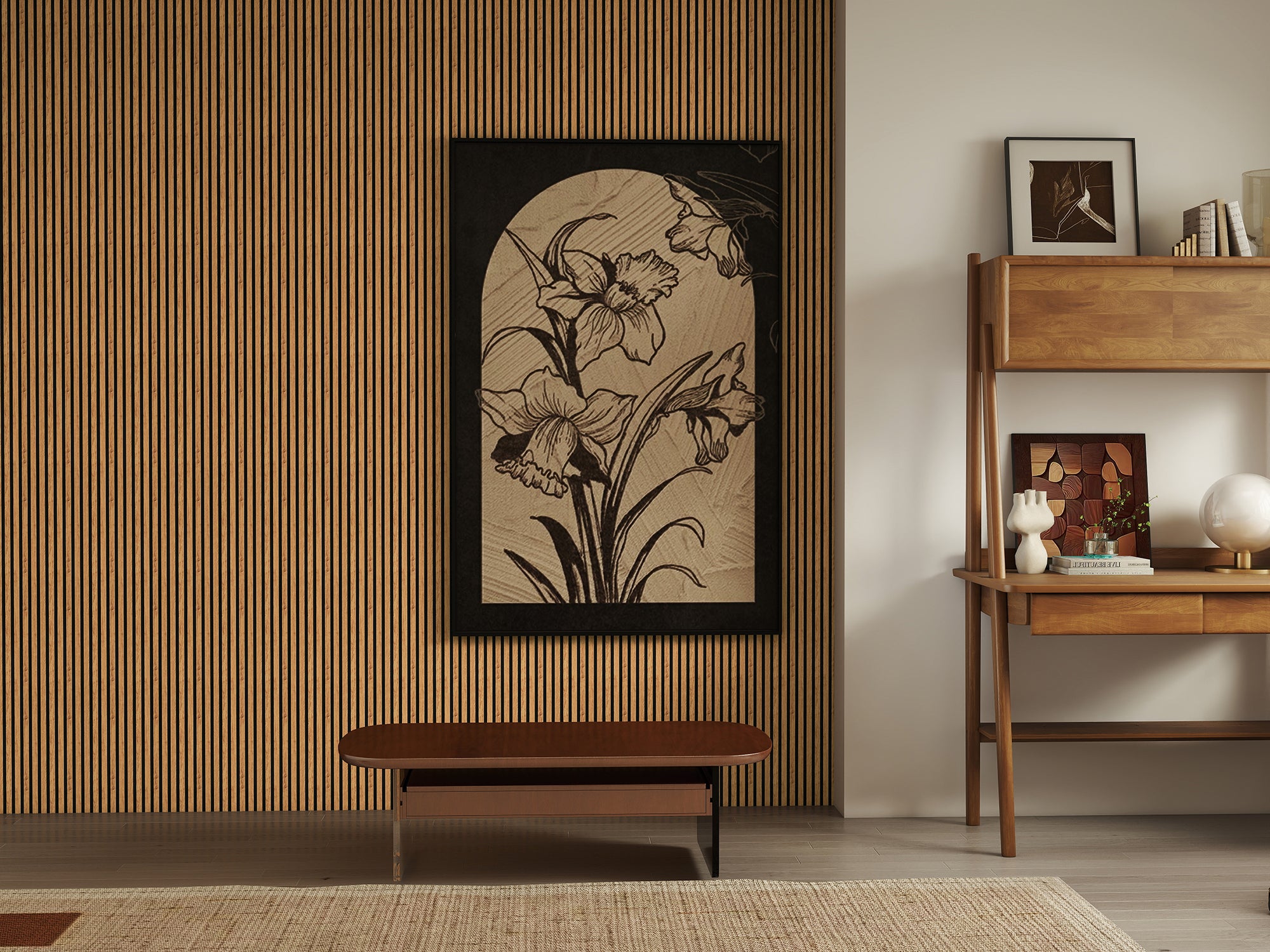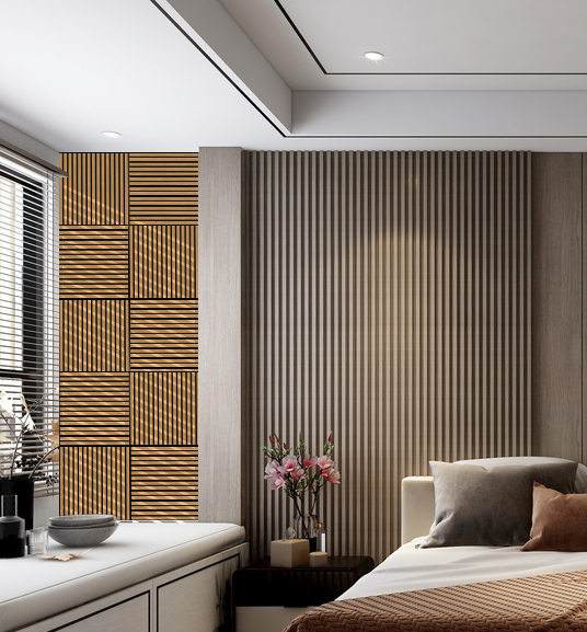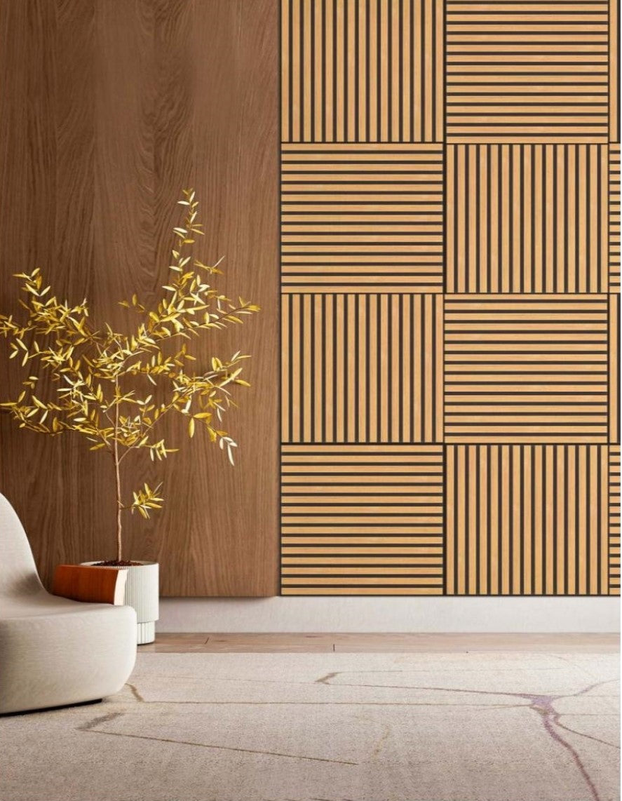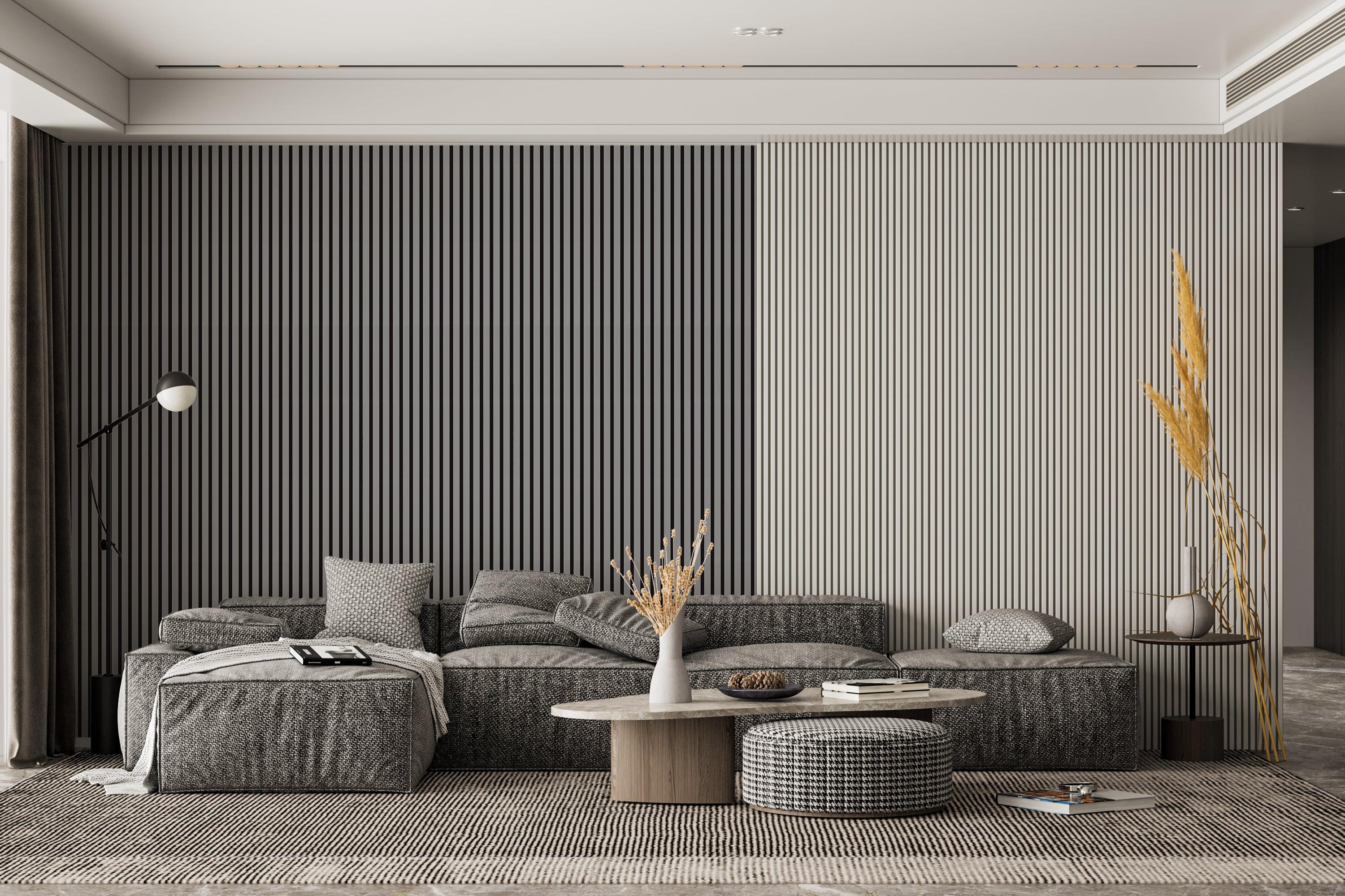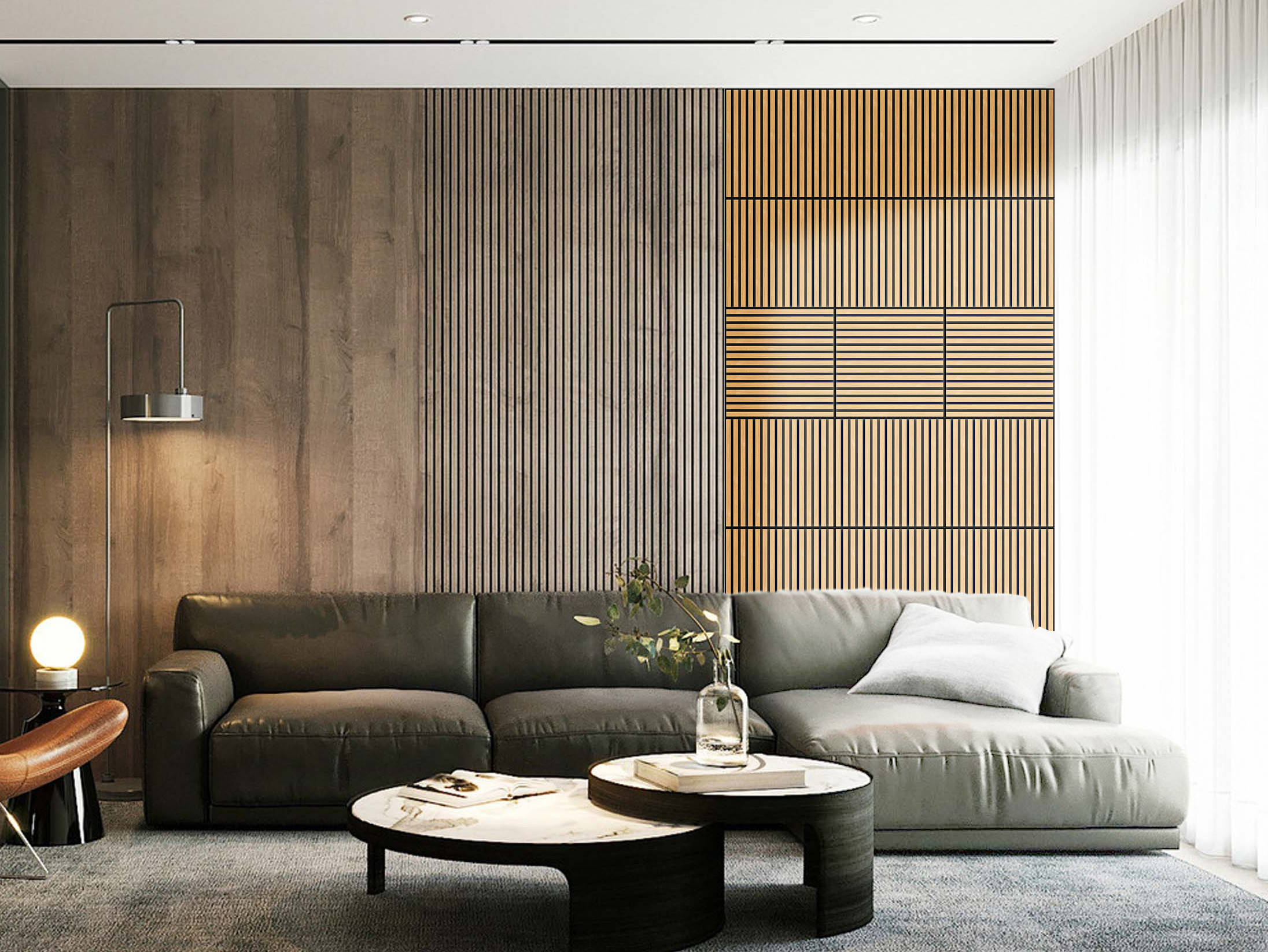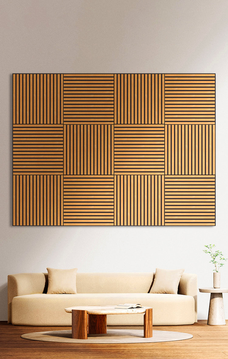 À camada acústica junta-se um painel ripado em MDF, com revestimento de madeira natural, que confere um aspeto diferenciado, autêntico e elegante ao produto. Este painel pode ter acabamentos de várias cores, da madeira mais clara à mais escura, aumentando a sua versatilidade.
