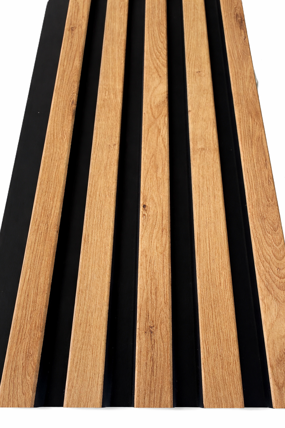 À camada acústica junta-se um painel ripado em MDF, com revestimento de madeira natural, que confere um aspeto diferenciado, autêntico e elegante ao produto. Este painel pode ter acabamentos de várias cores, da madeira mais clara à mais escura, aumentando a sua versatilidade.