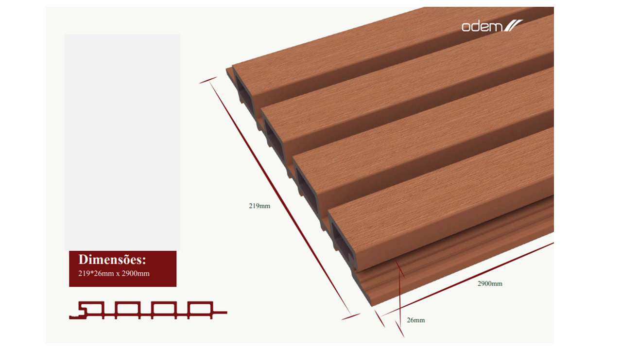 Na ODEM, disponibilizamos um tipo de painel ripado exterior em WPC que se distingue pela sua composição. Apresenta uma excelente capacidade de resistir a impactos, ao apodrecimento e a outras deformações. Mesmo sob sol intenso ou chuva forte, costuma preservar as suas características, o que se traduz numa maior durabilidade.